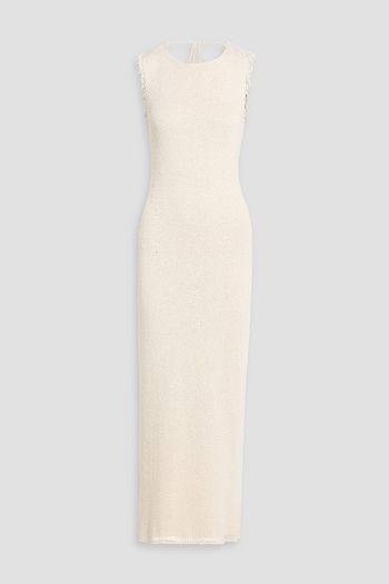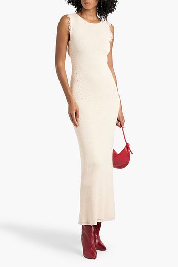 Eyelet-embellished fringed stretch-knit maxi skirt