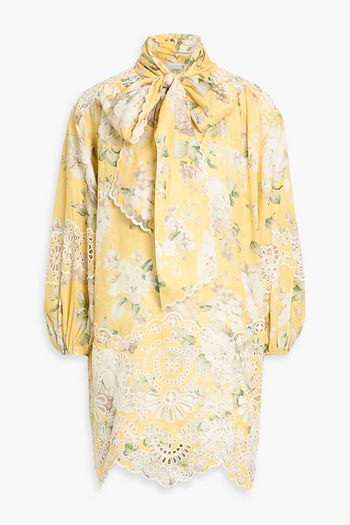 Broderie anglaise-trimmed floral-print linen-gauze mini dress