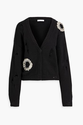 Crystal-embellished distressed cotton and cashmere-blend cardigan