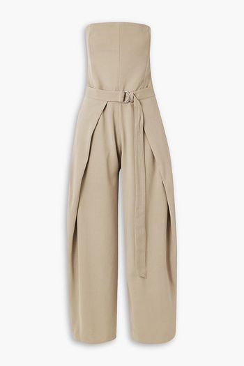 Strapless pleated belted twill jumpsuit