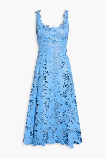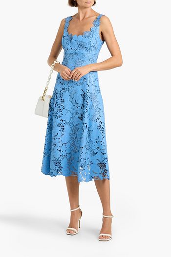 Floral-appliquéd laser-cut leather midi dress