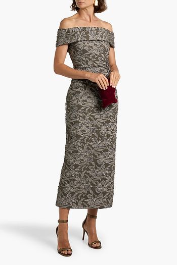 Off-the-shoulder embroidered charmeuse and tulle midi dress