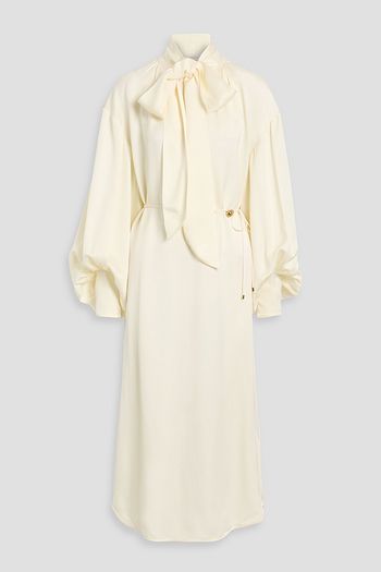 Lace-trimmed pussy-bow cotton-blend twill midi dress
