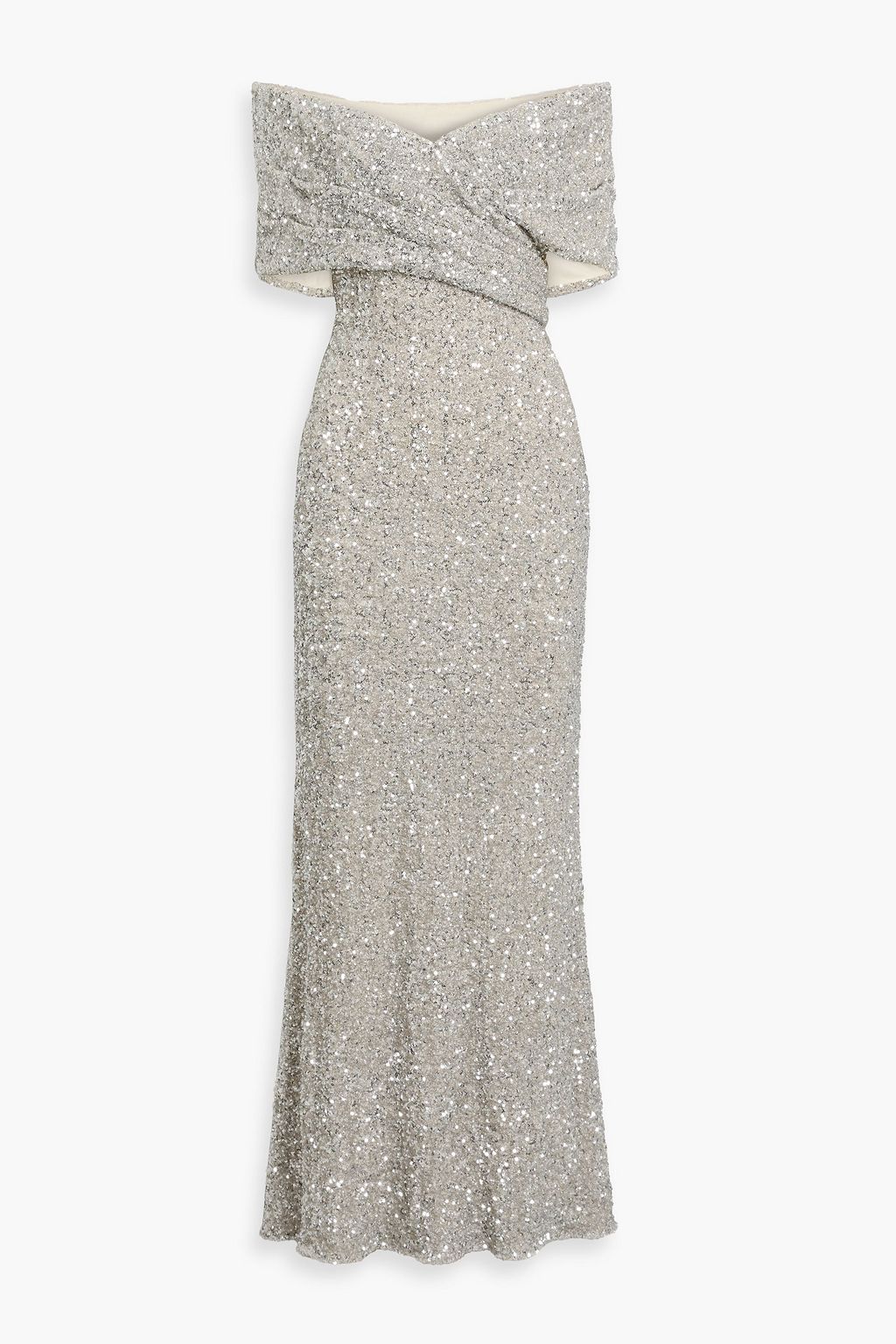 Cue the spotlight: Badgley Mischka’s sequined gown is made to dazzle. With an off-the-shoulder neckline and sparkling mesh that catches every flicker of light, it’s pure magic. Wear with metallic heels and a confident strut – shimmer season is officially in session.