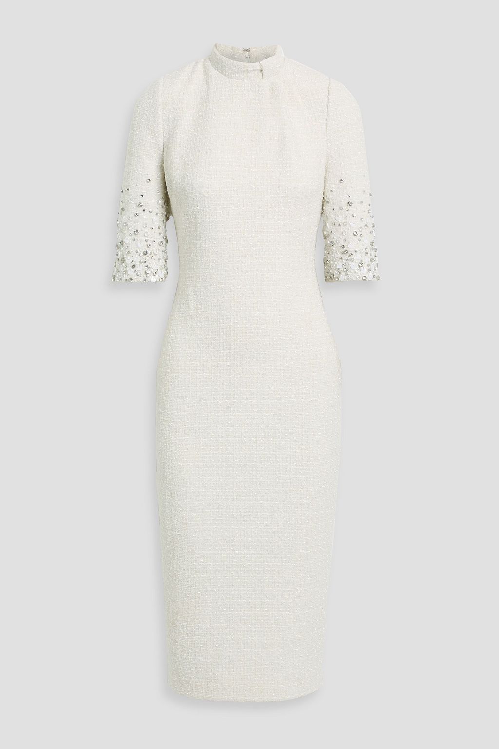 Courthouse ceremony or holiday fête? Badgley Mishka’s ivory tweed midi is ready for both. With sparkling embellishments and a polished silhouette, it’s a design you’ll always feel pretty in. Play with accessories depending on the occasion.