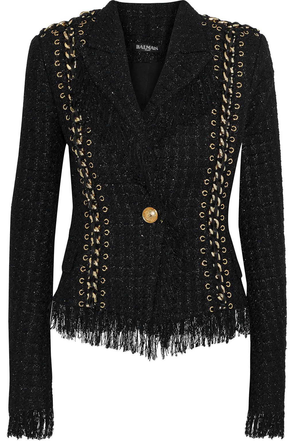 Chain-embellished metallic tweed jacket