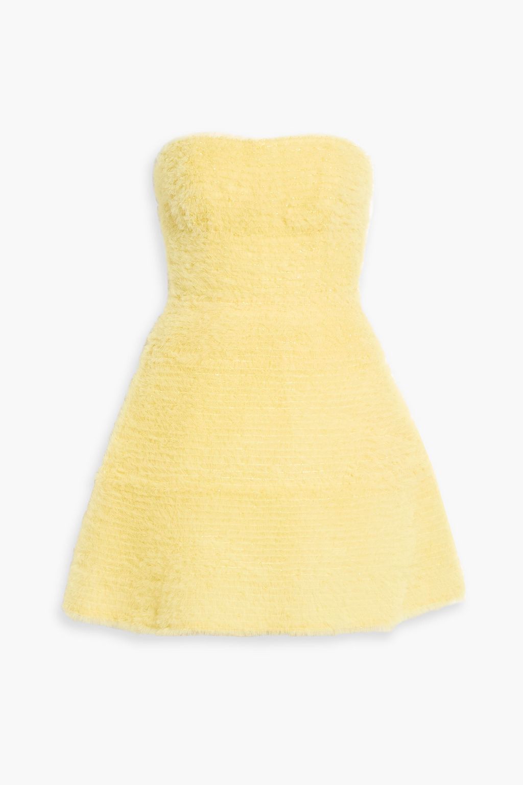Carolina Herrera’s butter-yellow mini is too cute. The strapless silhouette is cut from rows of ruffled tulle and sprinkled with tonal beads for a flash of fun. The flared hem is perfect for showing off those stems – make sure your pedi is fresh.