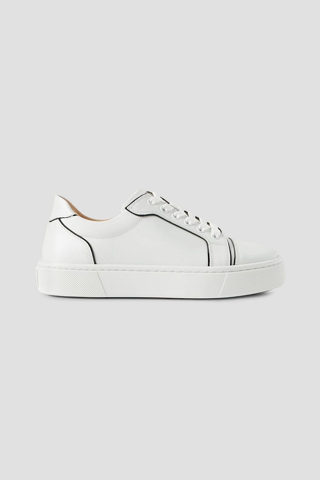Each panel of white leather used to make Christian Louboutin's 'Vieirissima' sneakers is complete with black edges, which gives them cool contrast. They've been made in Italy in a low-top silhouette and have cushioned collars and ventilating eyelets. Wear them with anything from sharp tailoring to feminine dresses.