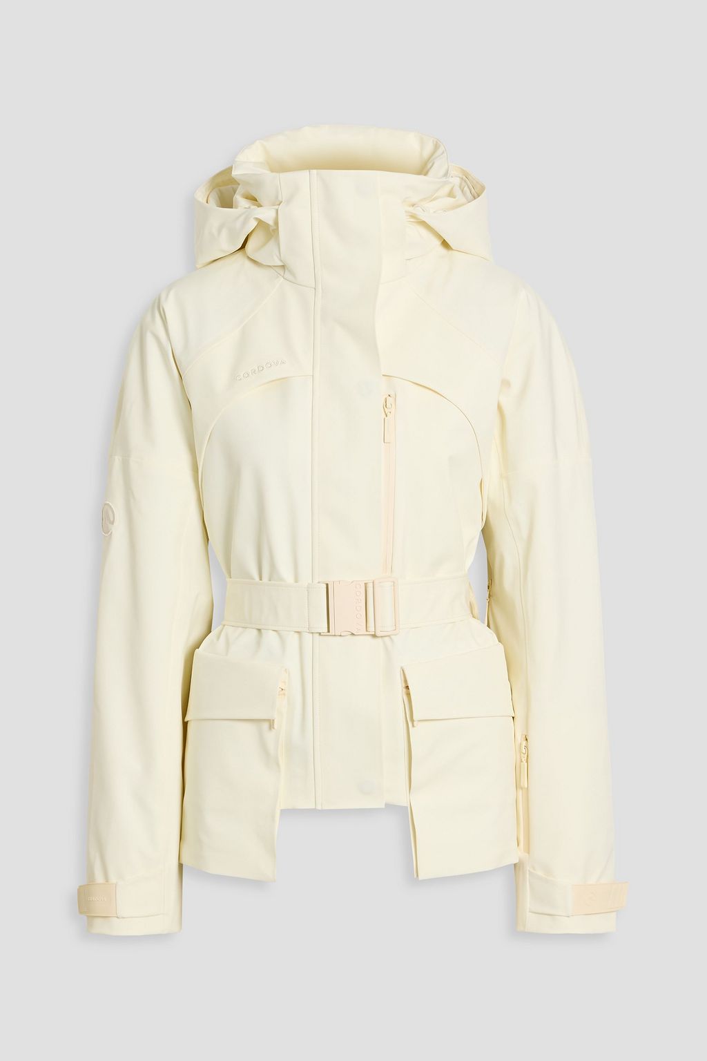 Drawstring hood, waist belt, zipped pockets (yes! one for your ski pass)