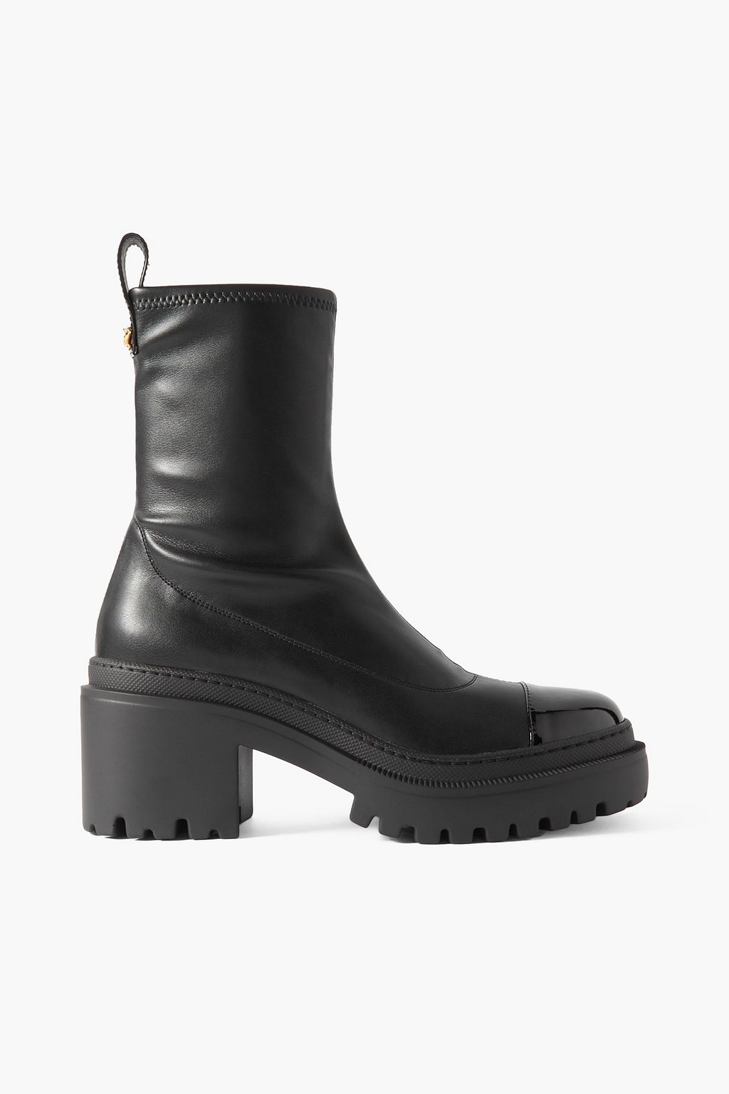 Giuseppe Zanotti's 'Cantadora' boots are made from faux leather and have glossy patent toe caps and heel tabs - the latter features the designer's initials in hammered gold-tone metal. They're designed for a close, comfortable fit and have chunky rubber soles to keep you grounded on slick surfaces.
