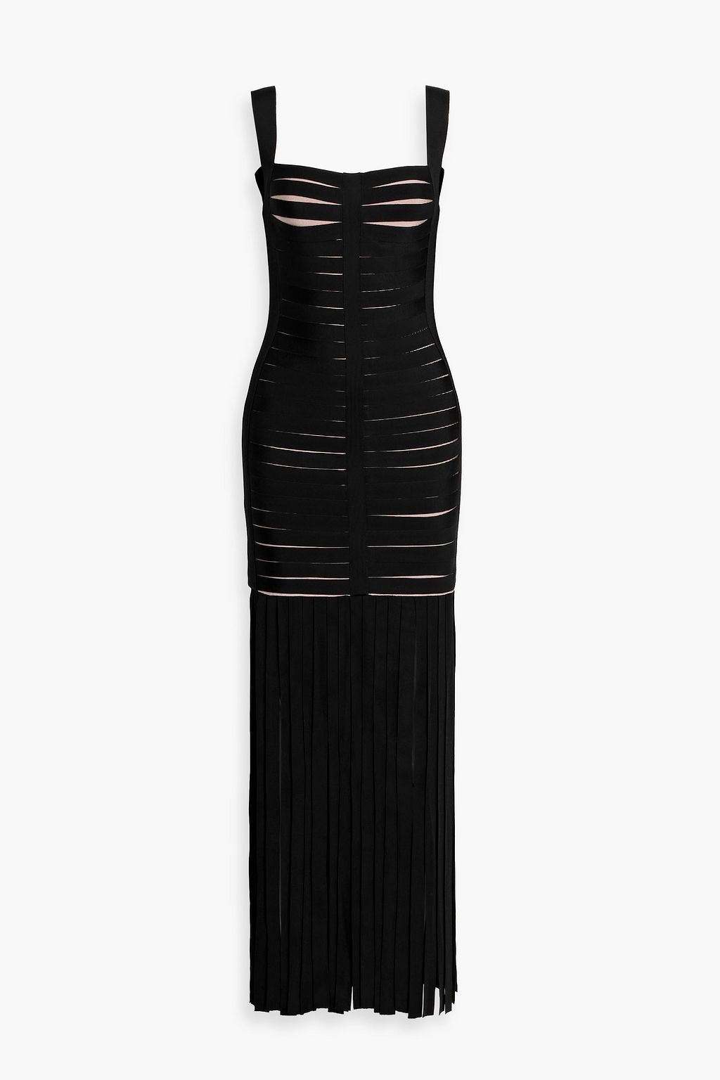 All eyes will be on you in Hervé Léger’s ‘Alessandra’ gown. Made from their signature sculpting bandage, it’s been sliced to reveal a contrasting lining that highlights your curves. Plus, the full-length fringed skirt shows off plenty of skin, depending on your pose.