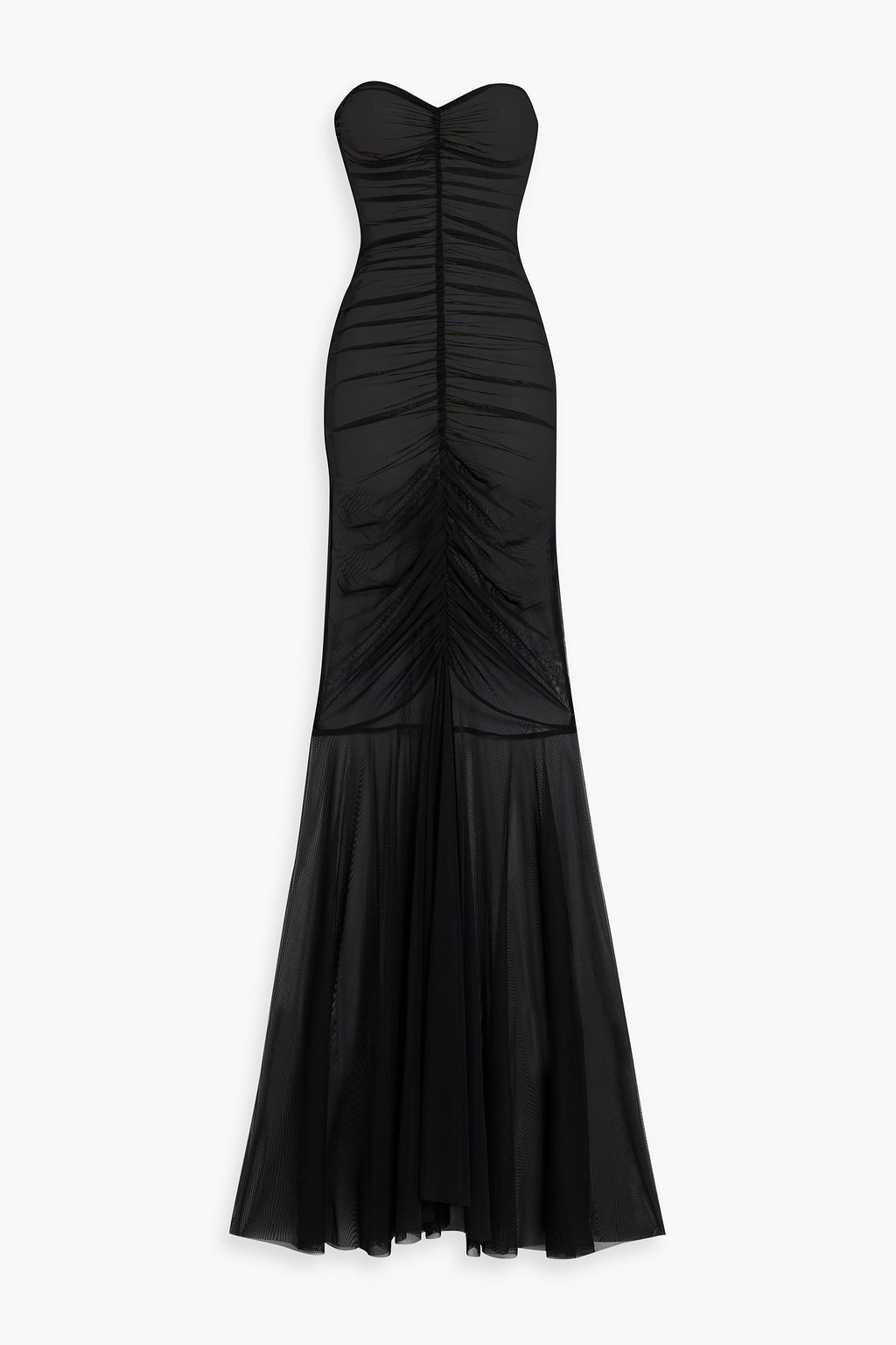 Norma Kamali’s strapless gown is made from sheer stretch-mesh for a stunning effect that’s both weightless and textured. Wear yours with tonal underpinnings for coverage and equally fabulous accessories.