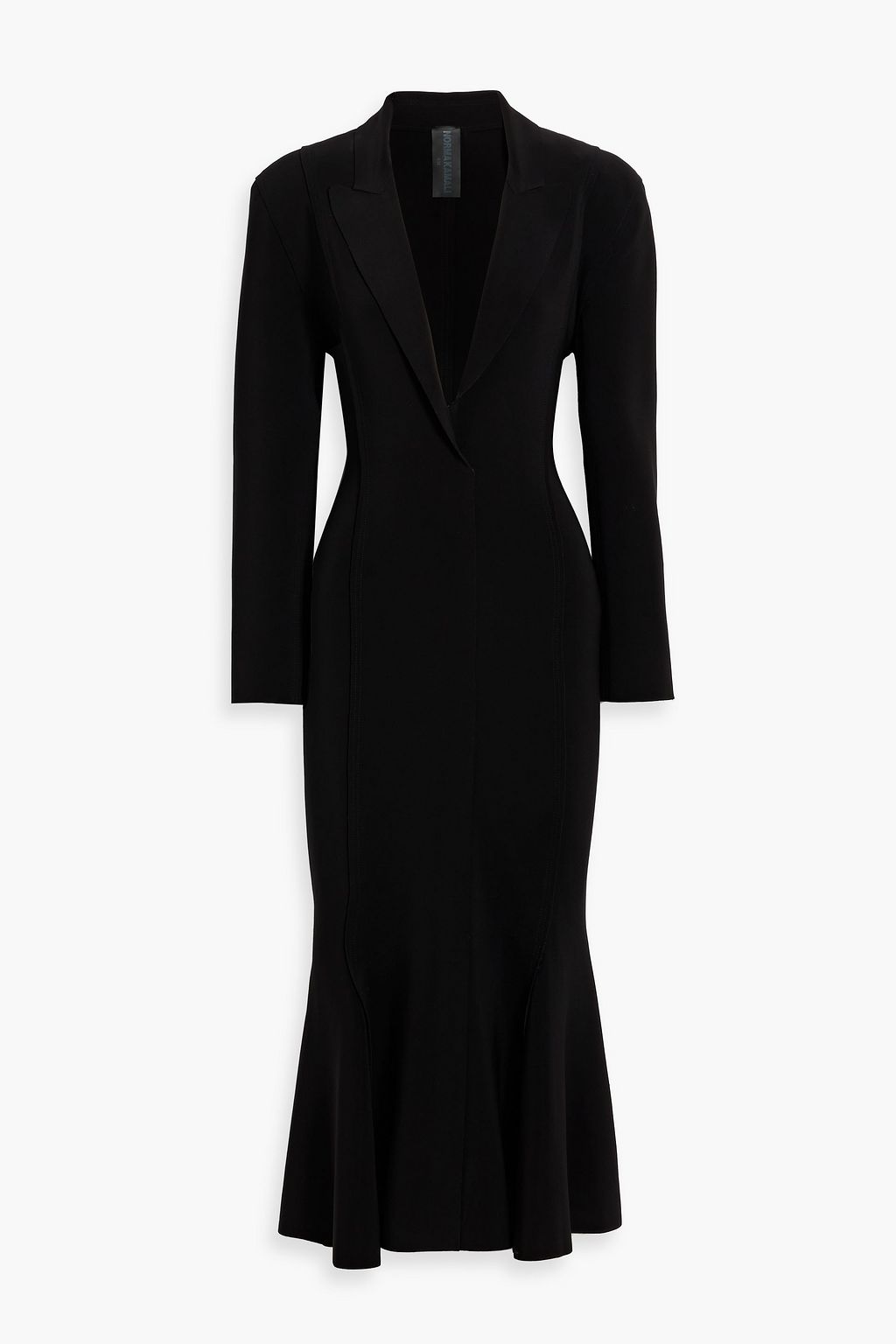 Norma Kamali’s black stretch-jersey midi is defined by its plunging neckline. The long sleeves and fluted hem add to its allure – play up the drama with statement accessories.