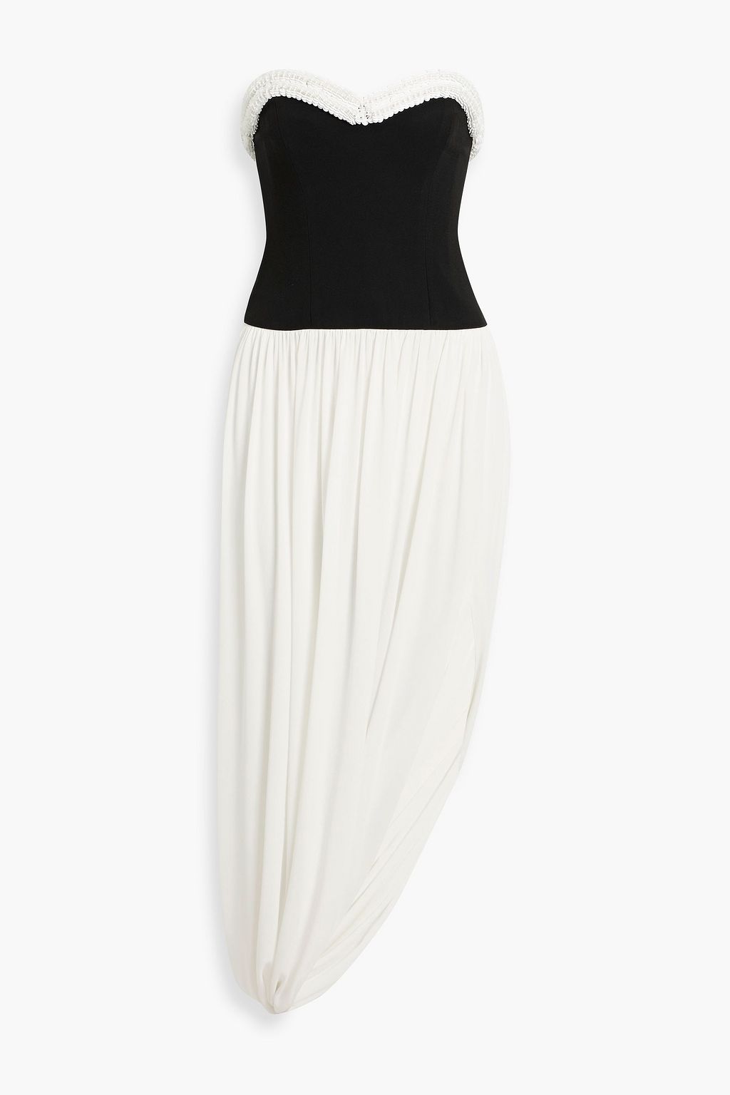 Simkhai’s ‘Augusta’ midi ticks all the boxes for a party dress – a chic strapless silhouette, modern black and white palette and rows of shimmering sequins along the neckline. Wear yours with tonal accessories and a bold lip – totally fabulous.