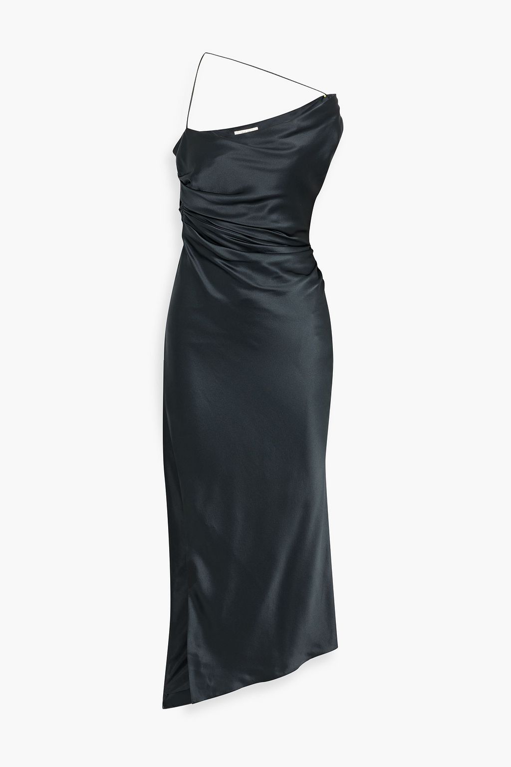 Cut from inky blue silk-satin, The Sei’s one-shoulder dress feels so glamourous with its draped silhouette and high side slit. The thin spaghetti strap is barely noticeable but adds just a bit of support for a worry-free night.