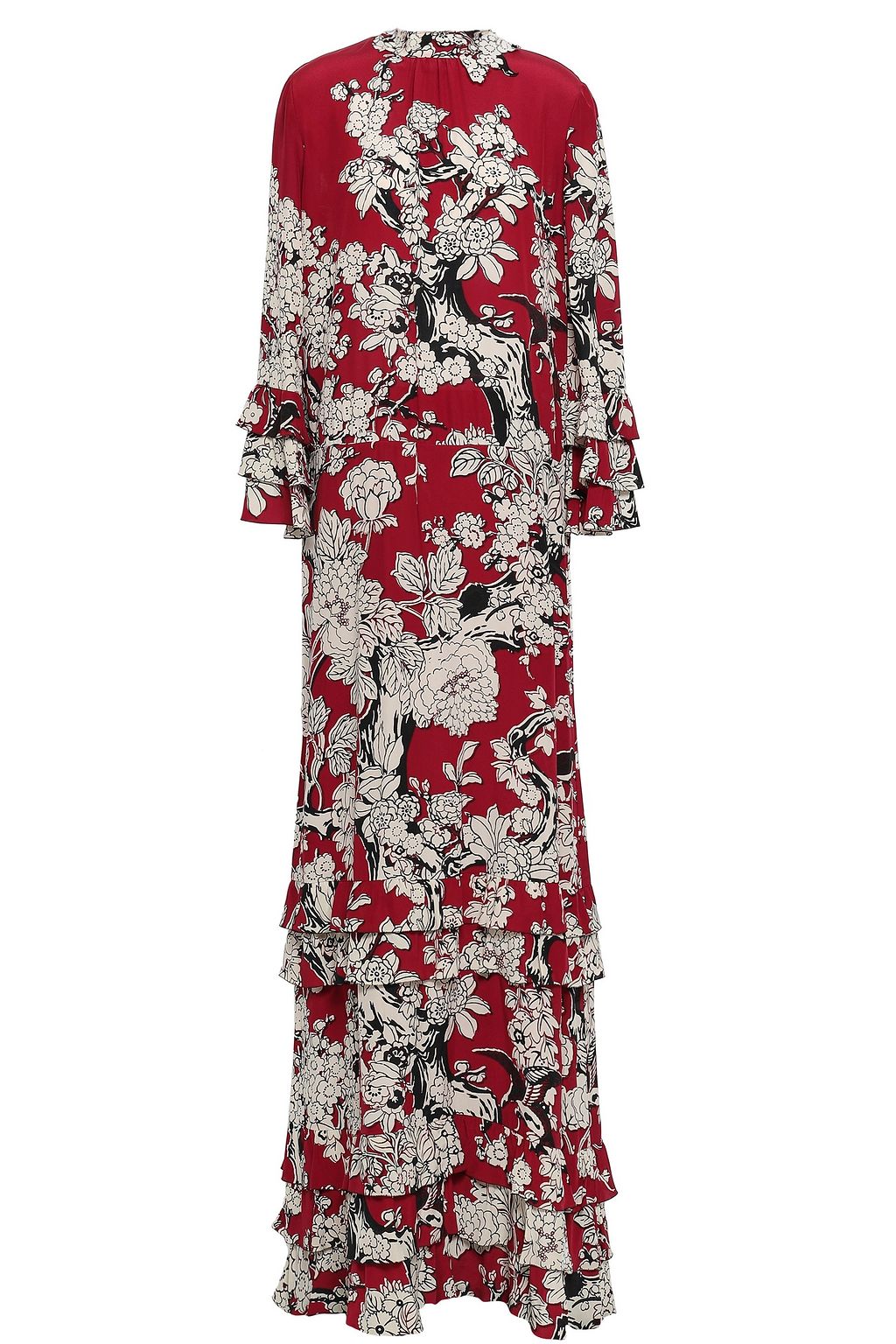 Valentino Garavani’s floral maxi is a stunning choice for benefits and dinner parties. Cut from silk crepe de chine, it has ruffled trims that dance along the cuffs and hem. Pair with heels and statement jewelry.