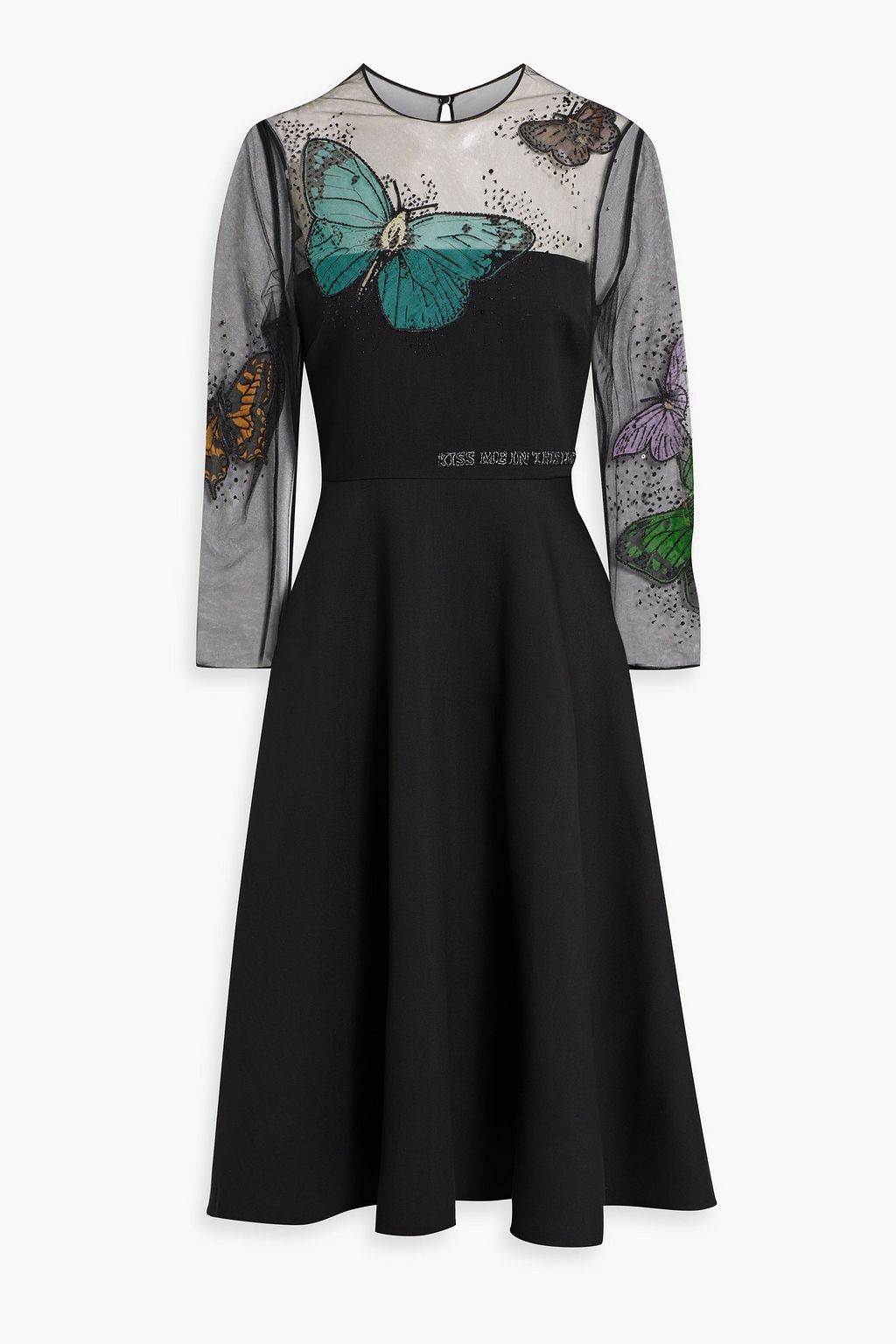 VALENTINO GARAVANI Embellished chiffon and tulle-paneled wool and silk-blend crepe midi dress
