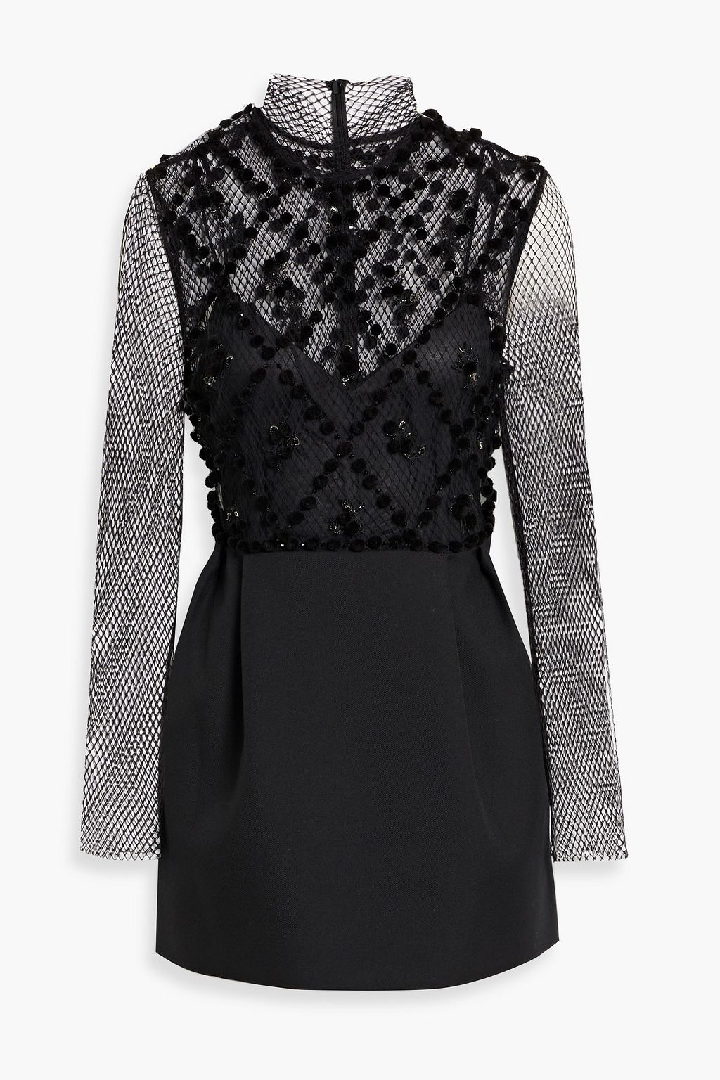 VALENTINO GARAVANI Embellished fishnet and cotton-blend gabardine mini dress