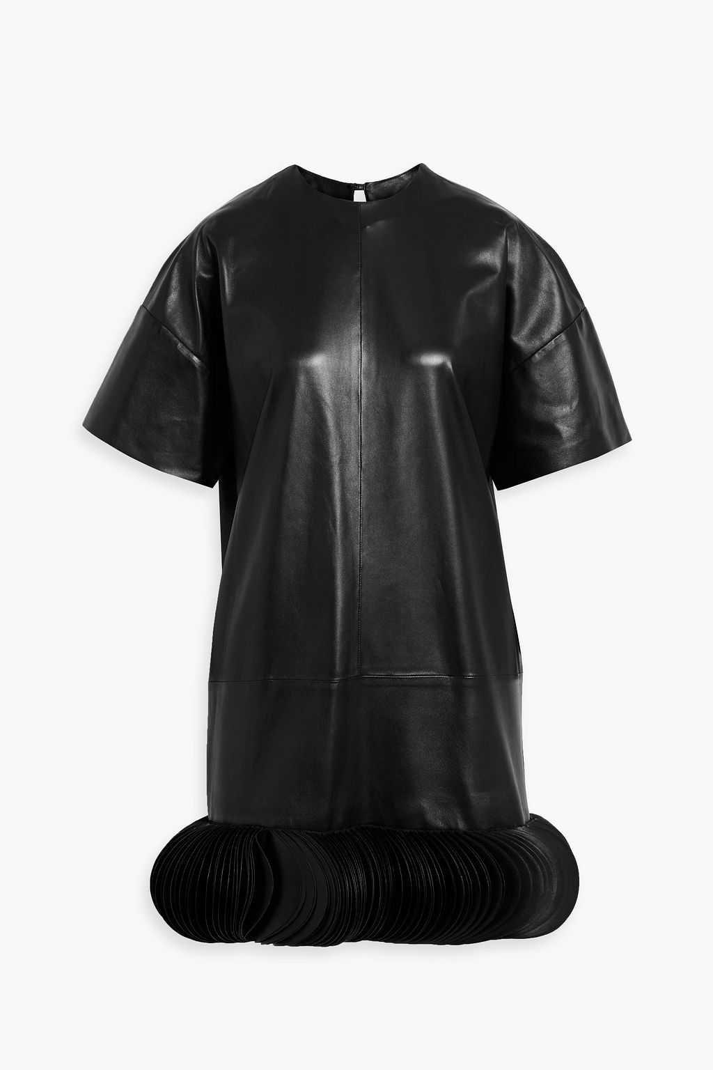 Valentino Garavaniās mini dress is a total upgrade for your wardrobe.Ā Made from smooth, supple leather, its ruffled hem is made from laser-cut discs that will move with you. Wear with stilettos, knee-boots or flats ā and get ready for compliments.