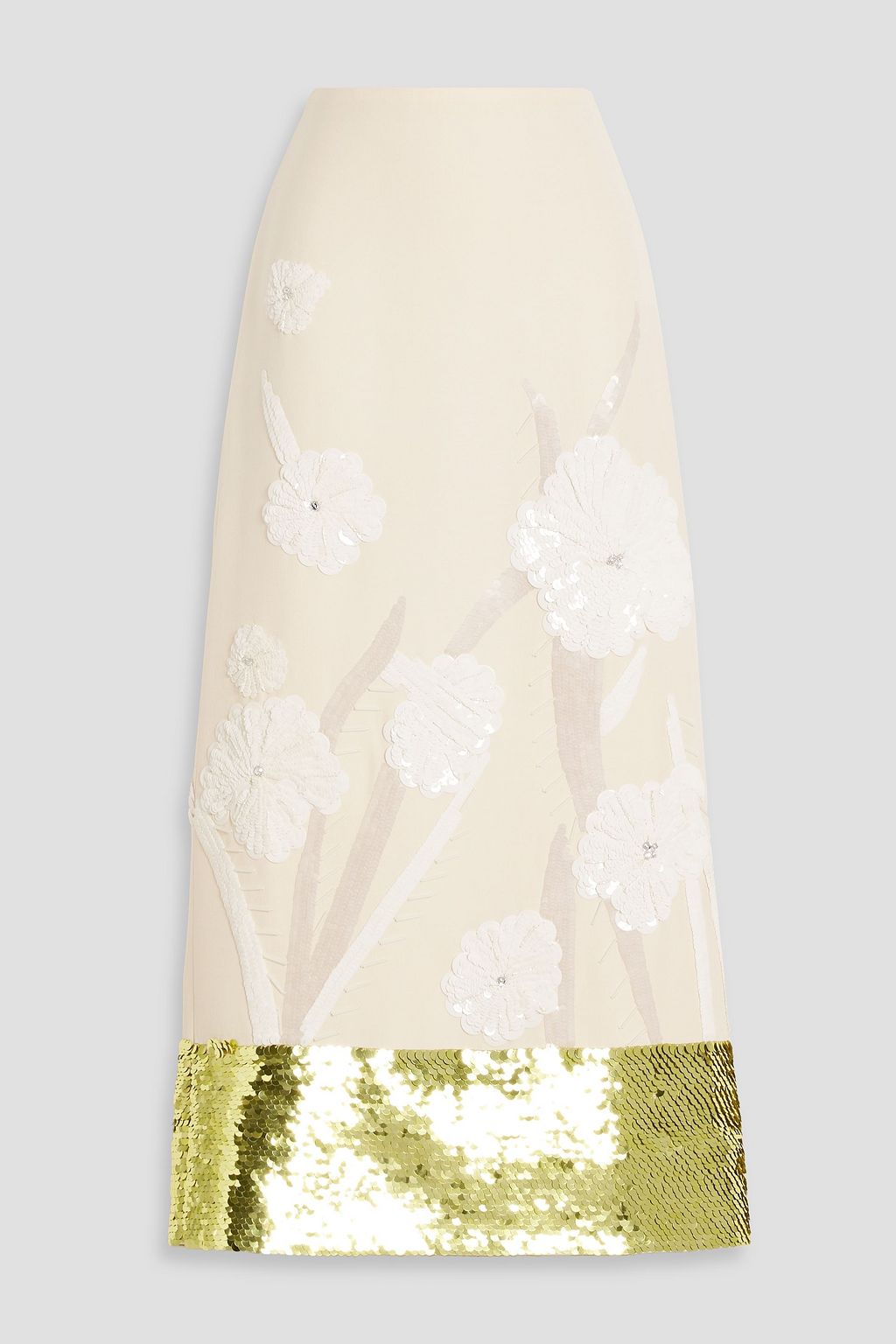 Your closet called - it wants more Valentino Garavani glamour. This wool and silk-blend crepe midi showcases sequined floral appliqués and a vibrant green hem. The back slit ensures you can sit and mingle with ease.