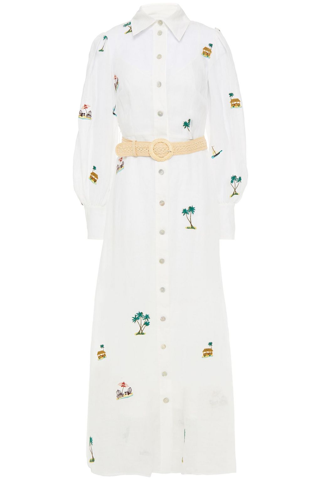 Belted embroidered ramie-gauze midi shirt dress