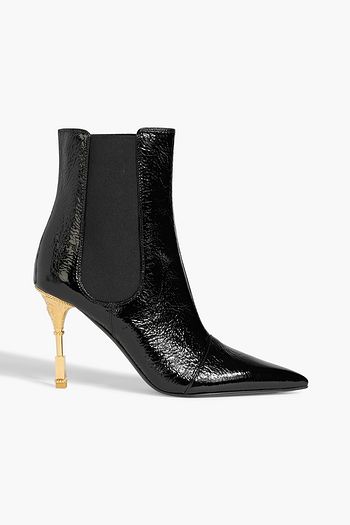Strapless embellished chiffon, tulle and patent-leather mini dress