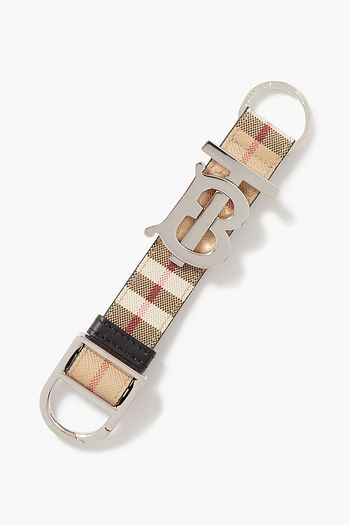 Checked leather-trimmed canvas keyring
