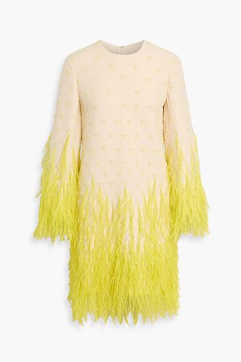 Off-the-shoulder feather-embellished wool and silk-blend crepe mini dress