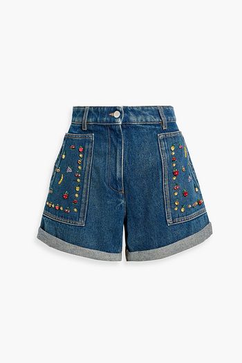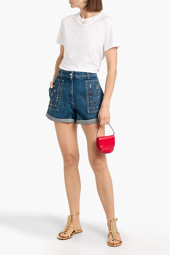 Cutout crystal-embellished frayed mid-rise wide-leg jeans