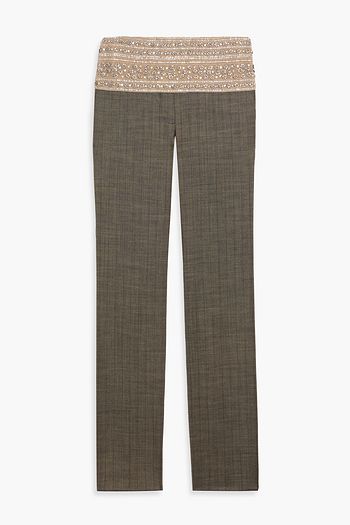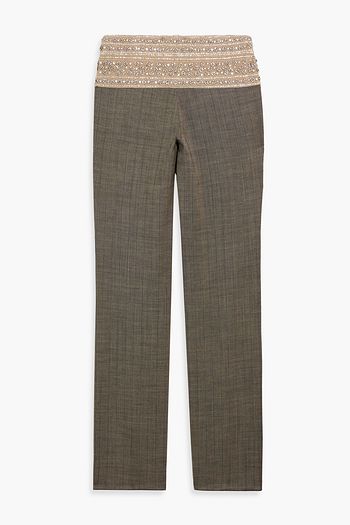 Crystal-embellished mesh-trimmed wool-twill straight-leg pants