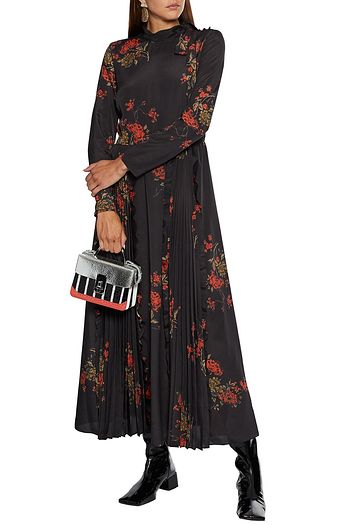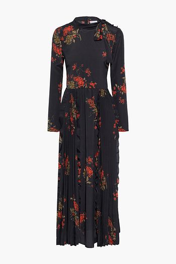 シルクサテンジャカード マキシワンピース ラッフル付き プリント入り