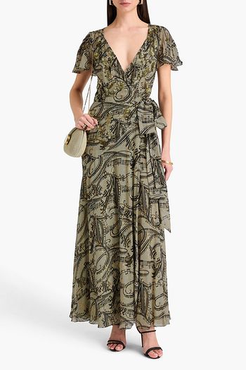 シルククレープデシン マキシワンピース リボンタイ プリント入り