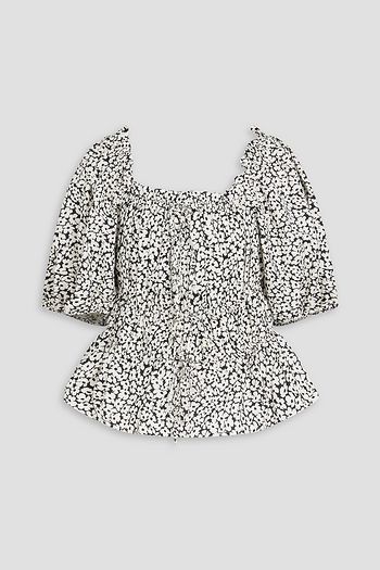 오프 더 숄더 셔링 장식 플로럴 프린트 태피터 탑