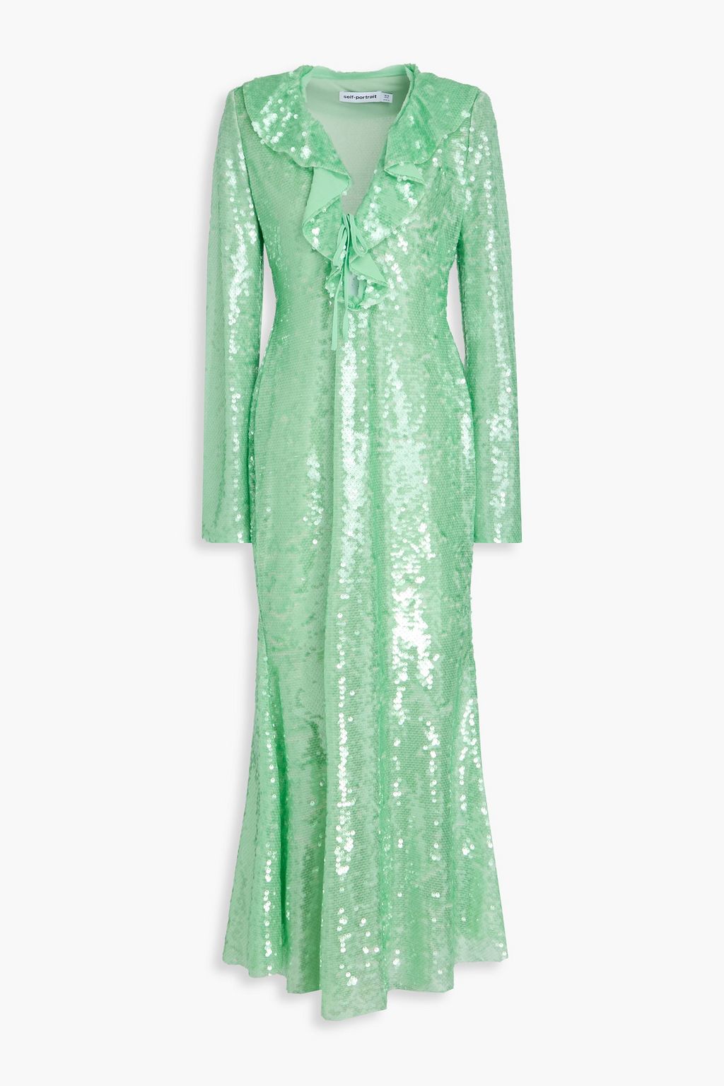 SELF-PORTRAIT 러플 디테일 시퀸 장식 메쉬 미디 드레스