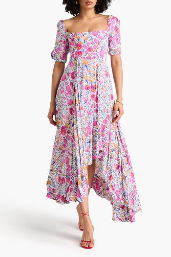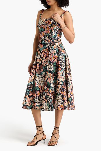 루쉬 장식 플로럴 프린트 에코베로 혼방 자카드 미디 드레스