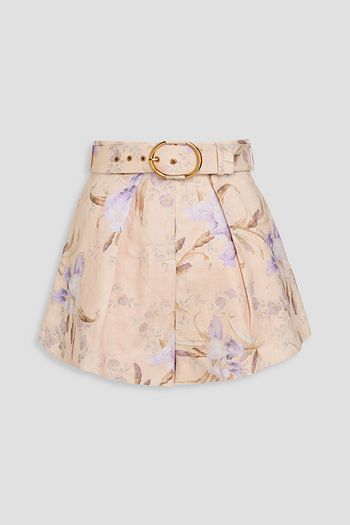 플로럴 프린트 리넨 벨티드 미디 드레스