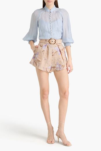 플로럴 프린트 리넨 실크 혼방 플리츠 미니 드레스
