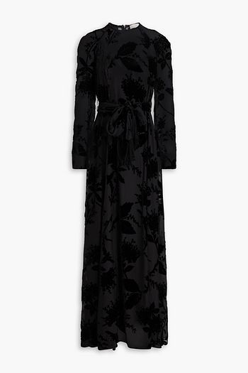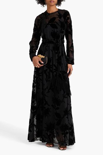 플로럴 프린트 코드 레이스 패널 울 실크 혼방 오간자 맥시 드레스